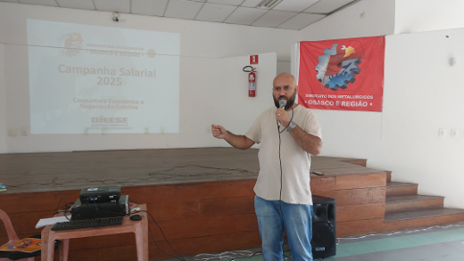 A apresentação do cenário econômico foi realizada pelo técnico do Dieese (Departamento Intersindical de Estatística e Estudos Socioeconômicos) da subseção do Sindicato, Guilherme Palmieri. Segundo dados compartilhados pelo técnico, os impactos do tarifaço será limitado no ramo metalúrgico, em 2024, 13% do material produzido pelas metalúrgicas na base do Sindicato foi para os Estados Unidos.