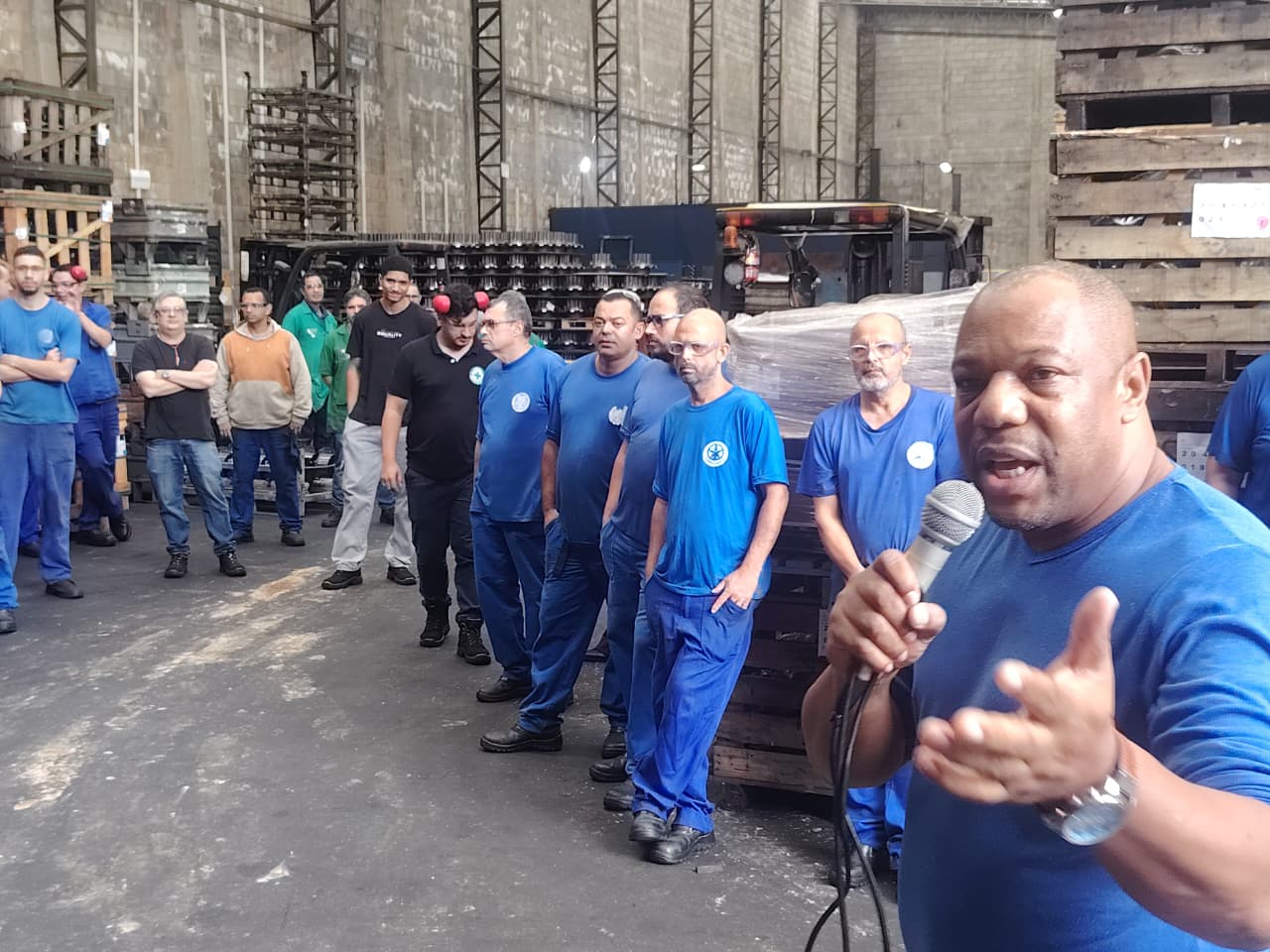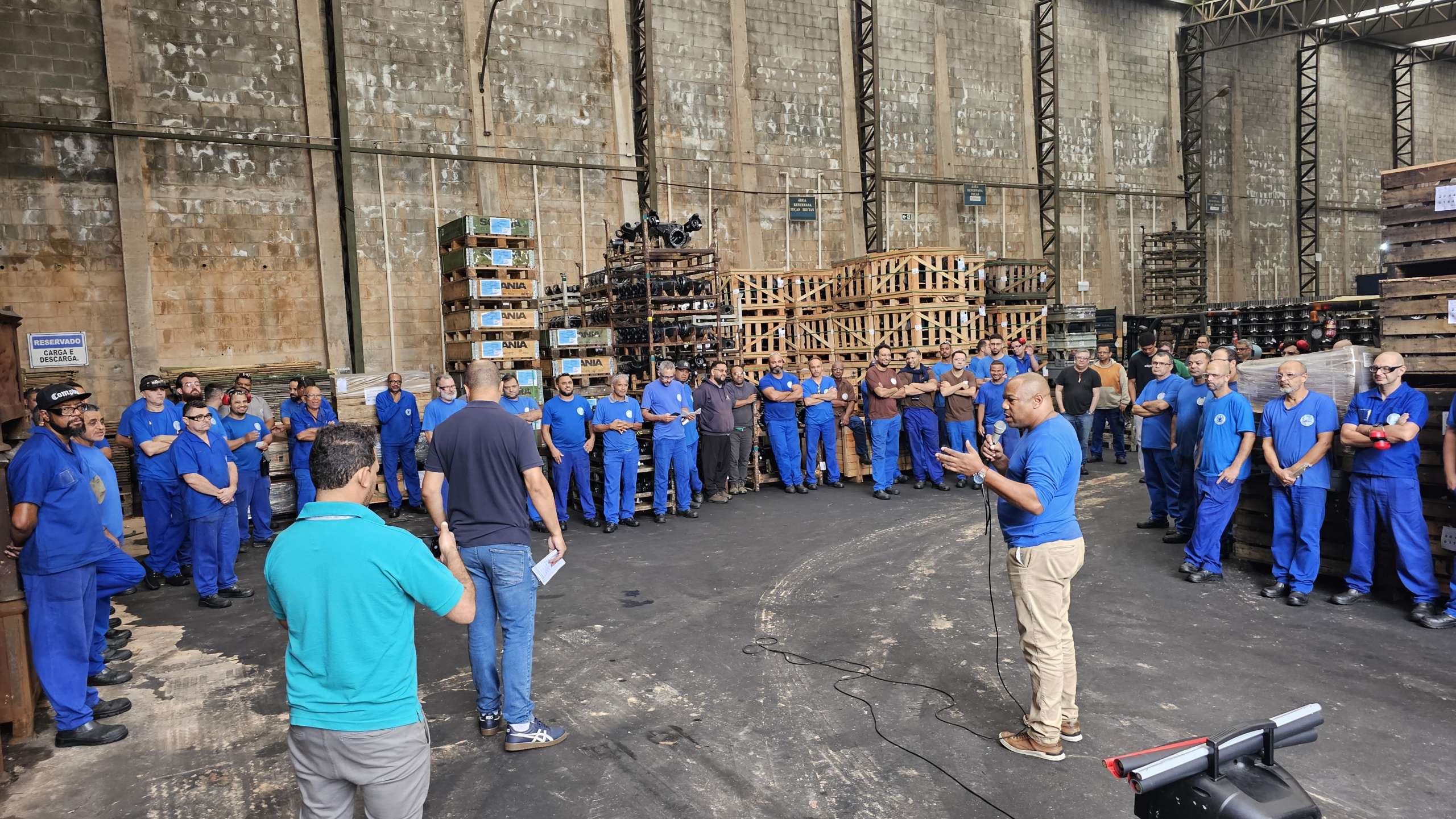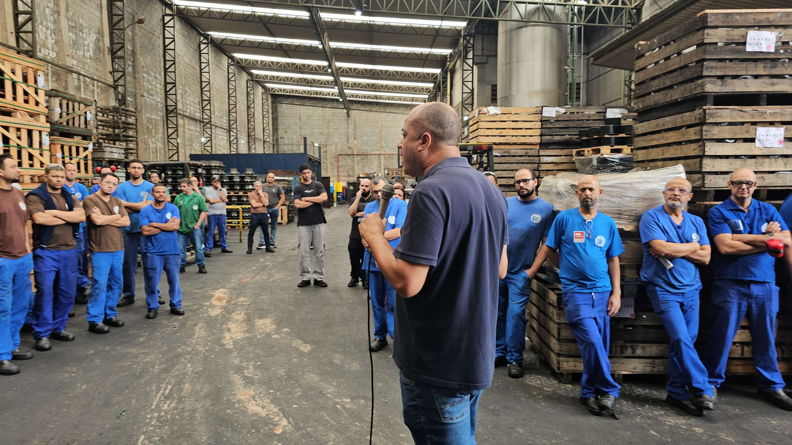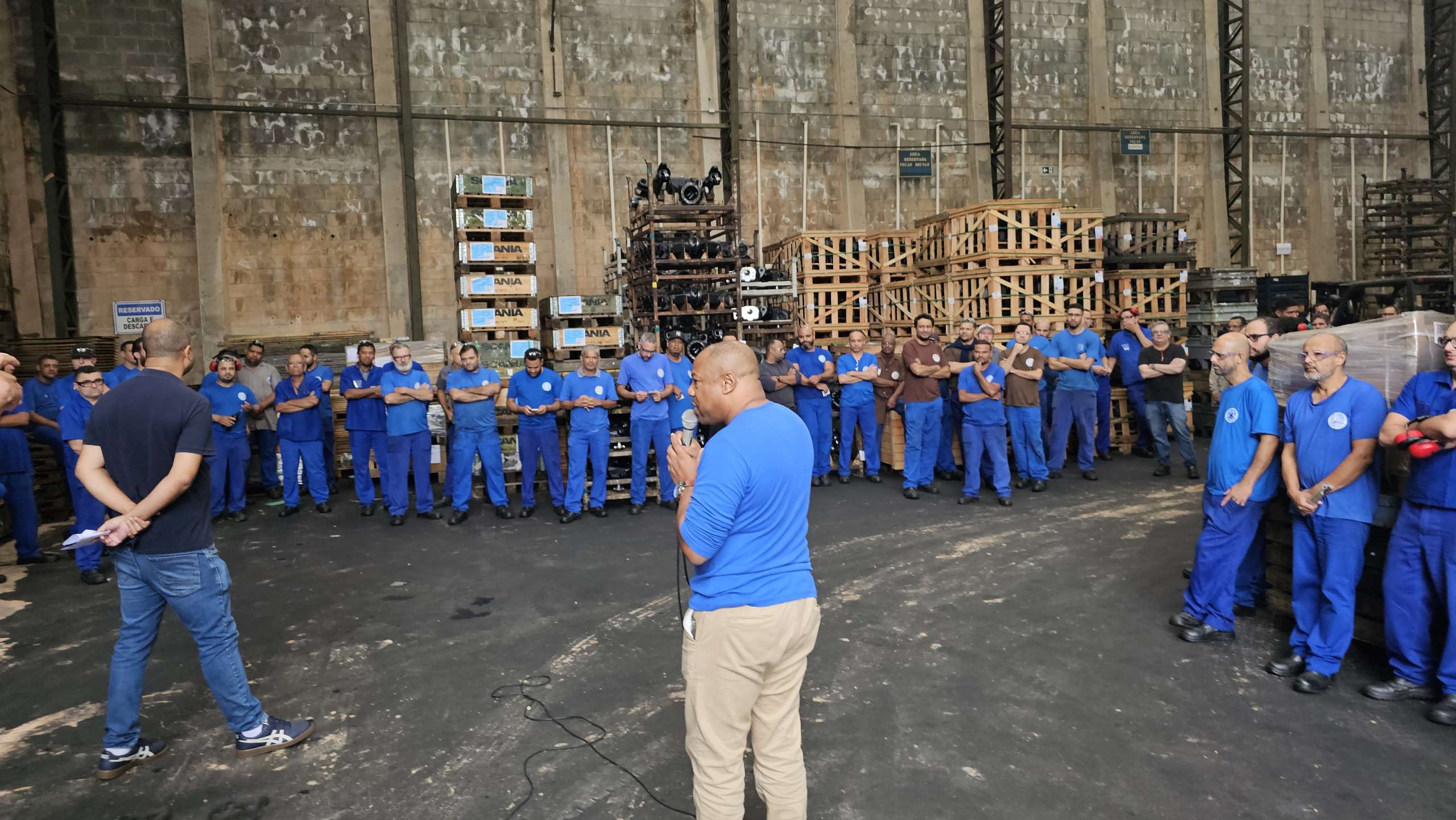 Companheiros e companheiras da Rossini ouvindo o diretor Carlos Eduardo (Garrafa)
