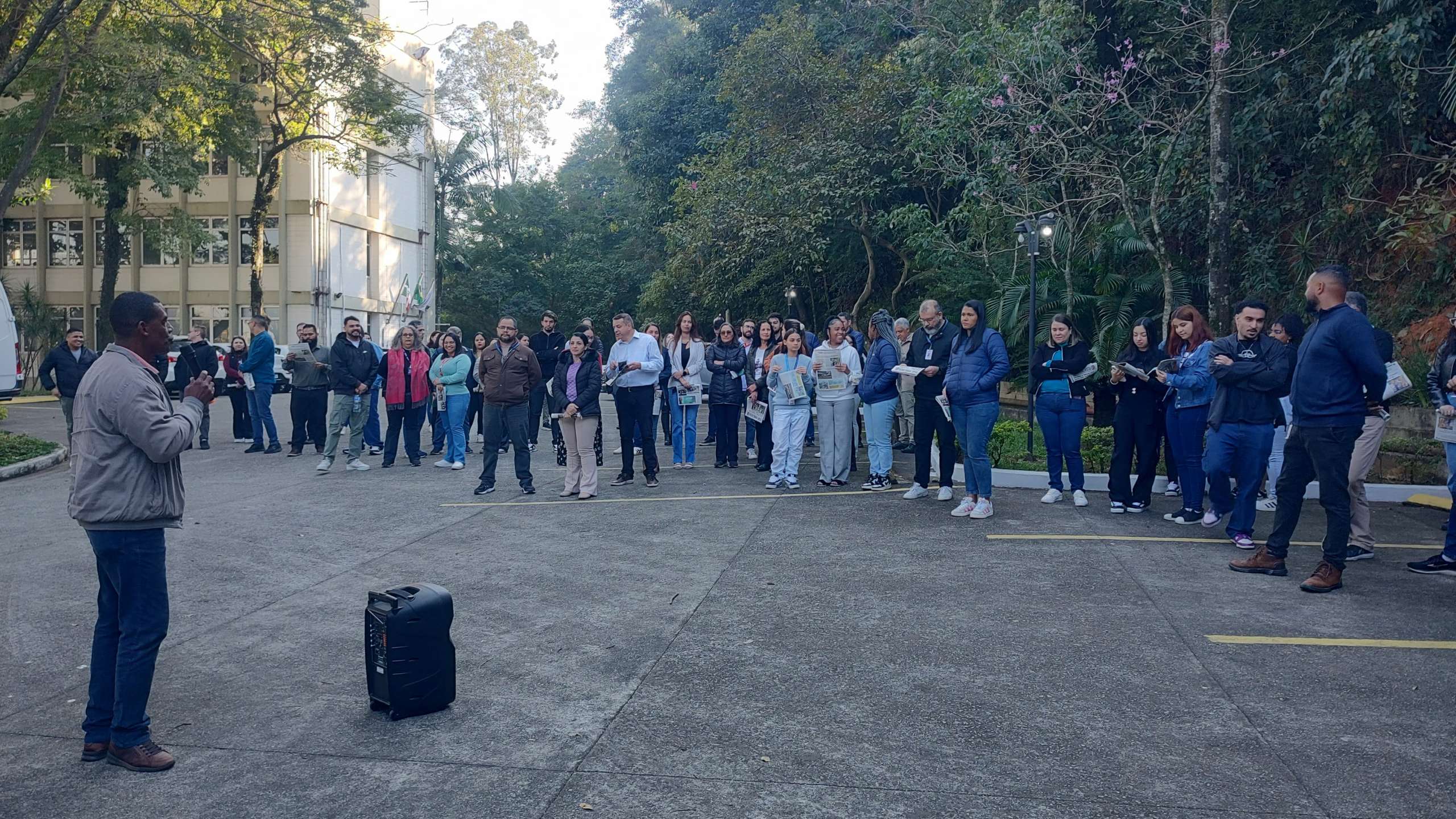 Secretário-geral do Sindicato falando aos companheiros e companheiras da Nakata.