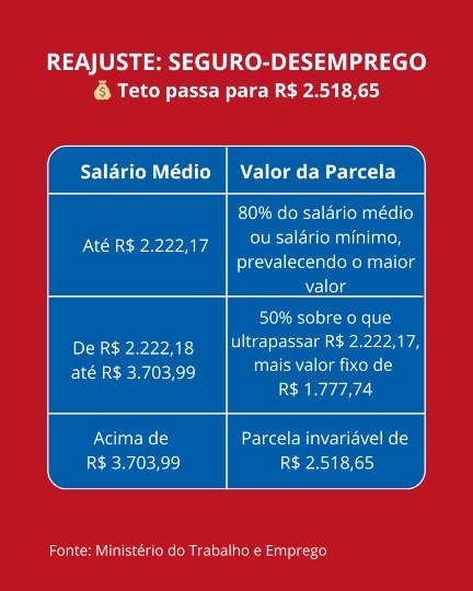 O teto do seguro-desemprego passou de 2.424,11 para R$ 2.518,65, um aumento de 3,9%. O piso do benefício acompanha o novo salário mínimo e passa de R$ 1.518 para R$ 1.621. A tabela de calcula foi atualizada pelo Ministério do Trabalho e Emprego e está valendo desde 12 de janeiro.