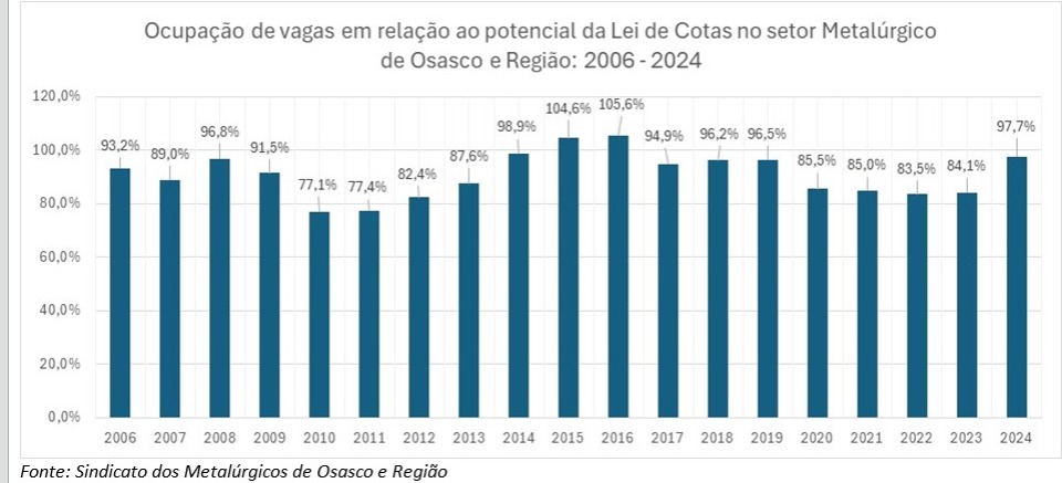 No ano passado, 54,4% das empresas cumpriram integralmente a legislação, e algumas foram além, o que levou o índice geral para 97,7% de cumprimento em relação ao potencial da Lei de Cotas no setor.