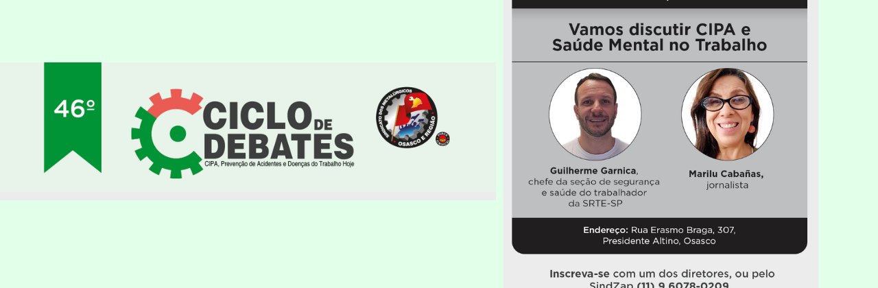 Os metalúrgicos e metalúrgicas de Osasco e região têm mais uma oportunidade para participar do 46º Ciclo de Debates. Isto porque o último encontro vai acontecer na próxima quinta-feira, 31, na sede do Sindicato, a partir das 18h30. Em discussão: CIPA e Saúde Mental no Trabalho. Para subsidiar a discussão, vamos contar com a palestra … Continue lendo Último encontro do 46º Ciclo de Debates acontece na próxima quinta na sede; participe!